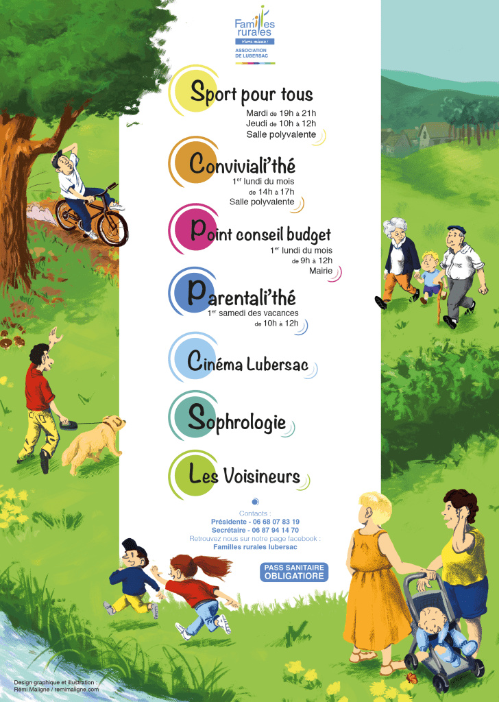 L’association familles rurales de Lubersac m’a demandé de réaliser une affiche illustrée pour communiquer sur les différentes actions qu’ils mènent et les ateliers qu’ils mettent en place.