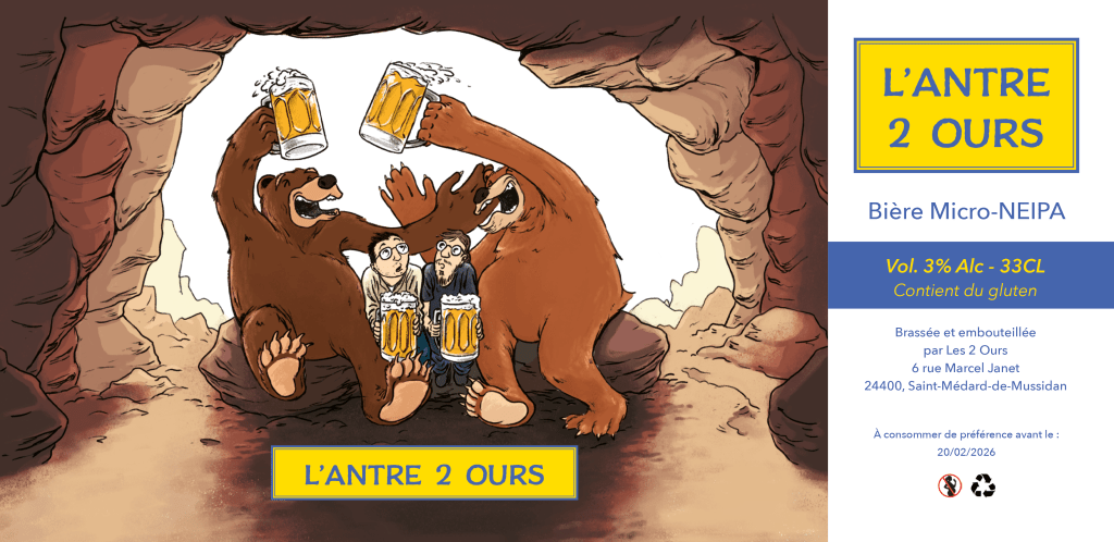 Étiquette réalisée pour une bière spéciale que l’Antre jeux (bar à jeux à Limoges) a fait brasser pour fêter leur 5eme anniversaire. L’idée était de créer une illustration humoristique et cartoonesque mettant en scène les gérants du bar et deux ours (clin d’œil à la brasserie qui a brassé cette bière spéciale).